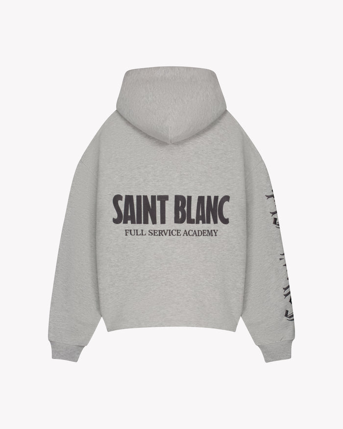 Introducing the Collective Academy Loose Zipper: The perfect grey zipper. Built from premium heavyweight fleece with a soft brushed interior for everyday wear. Designed with an oversized cropped fit, featuring puff-printed Saint Blanc Full Service Academy branding on the back, a sleeve print and raised SB logo on the chest. Finished with a full metal zipper and front pouch pockets.