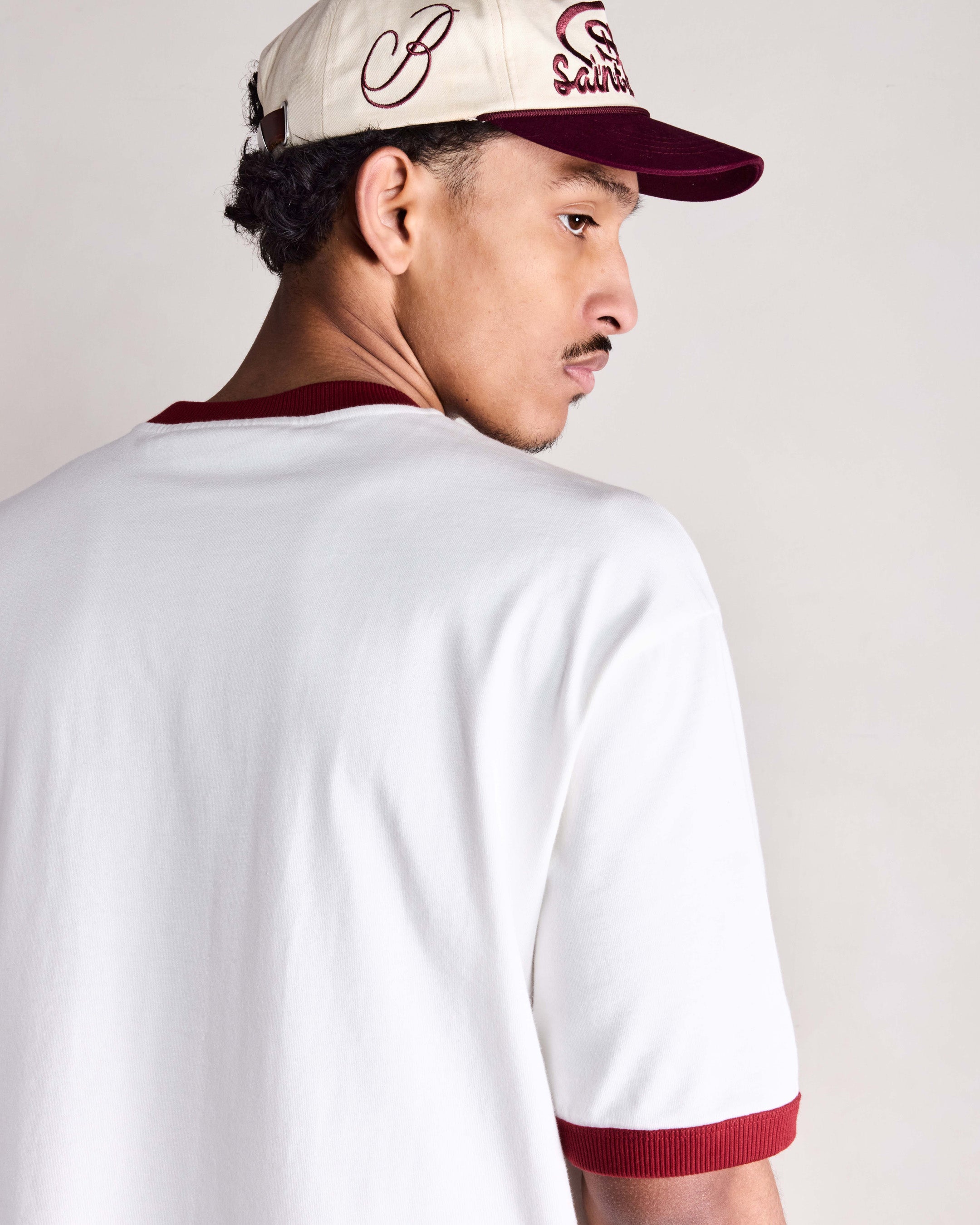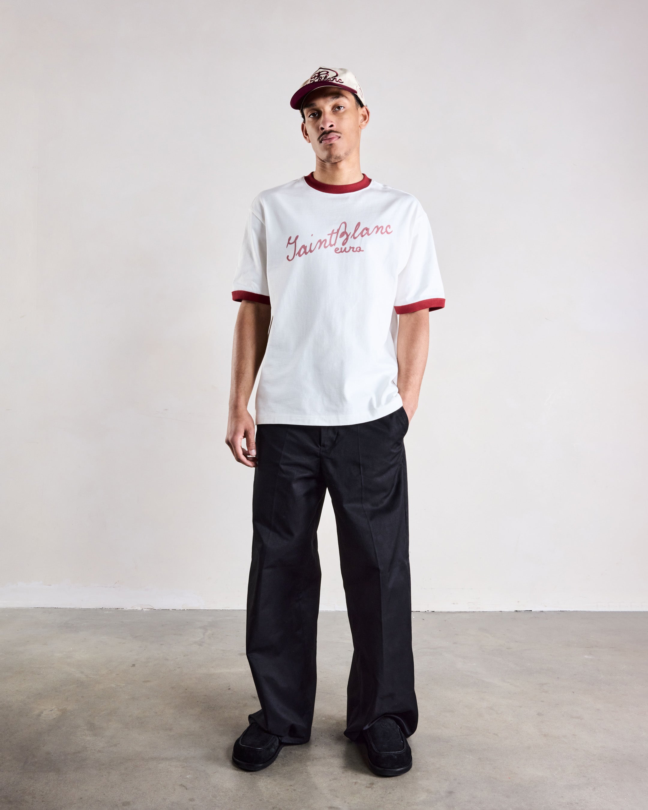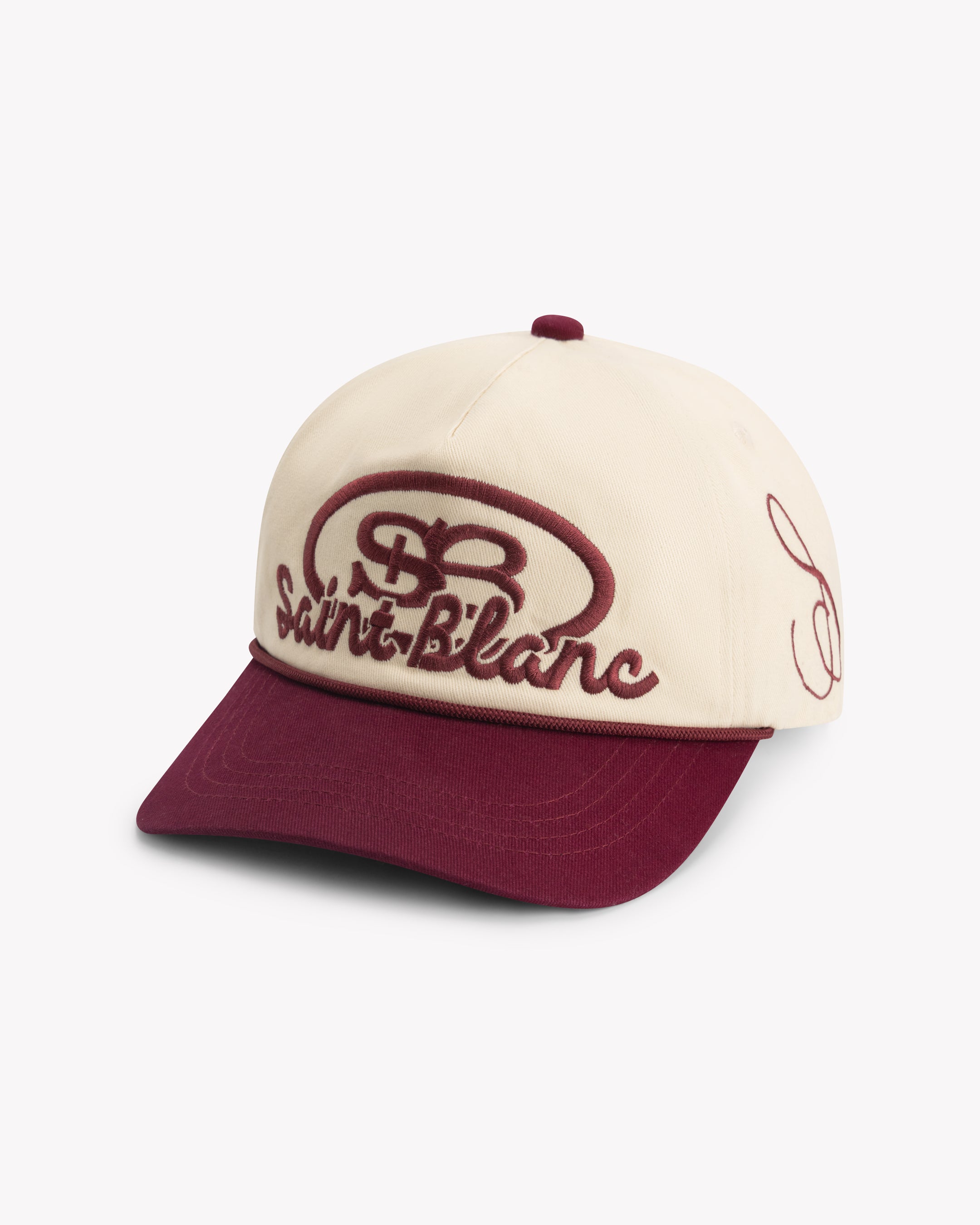 A classic Saint Blanc cap defined by clean lines and signature script branding. Featuring raised Saint Blanc embroidery across the front with tonal logo detailing at the side. Finished with a curved brim and leather strap closure for an elevated everyday fit.